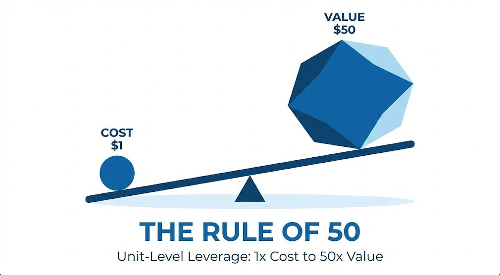 When you combine these ($10 customer value ÷ $0.20 company cost), you get 50x value creation.